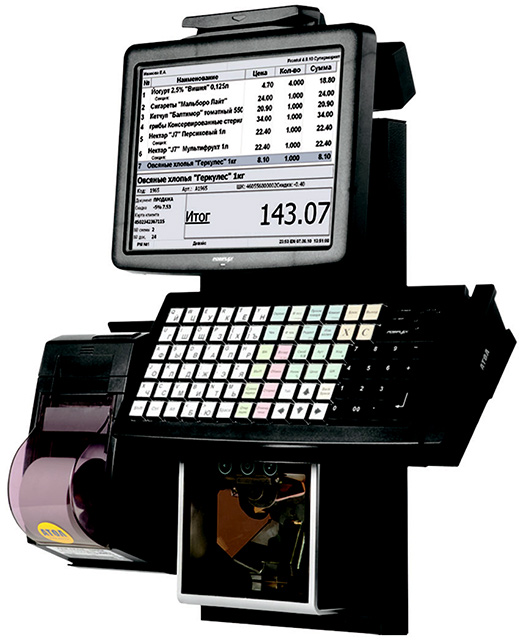 Фискальный регистратор FPrint-55ПТK (скорость термопечати 220 мм/сек, с автоотрезом); Безвентиляторный моноблок Posiflex Jiva FanFree KS-6810 (процессор Intel Atom N270 1,6 GHz, RAM 1GB DDR2, 1 слот, HDD 160GB, 3 COM, 1 LPT, 5 USB, 1 CR); Встроенный влагозащищенный монитор 10,4" (разрешение 800x600); Встроенный в моноблок ридер магнитных карт на 1–2 дорожки; Специализированная клавиатура (84 программируемые клавиши); Денежный ящик FlipTop Posiflex CR-2200 (6 отделений для купюр, 8 отделений для монет); Дисплей покупателя (2 строки по 20 символов, размеры символа 9,03 мм x 5,25 мм); Сканер штрихкодов Honeywell MS7820 Solaris (интерфейсы RS-232, USB HID, USB COM); Сетевой фильтр; Стойка фронтального решения.