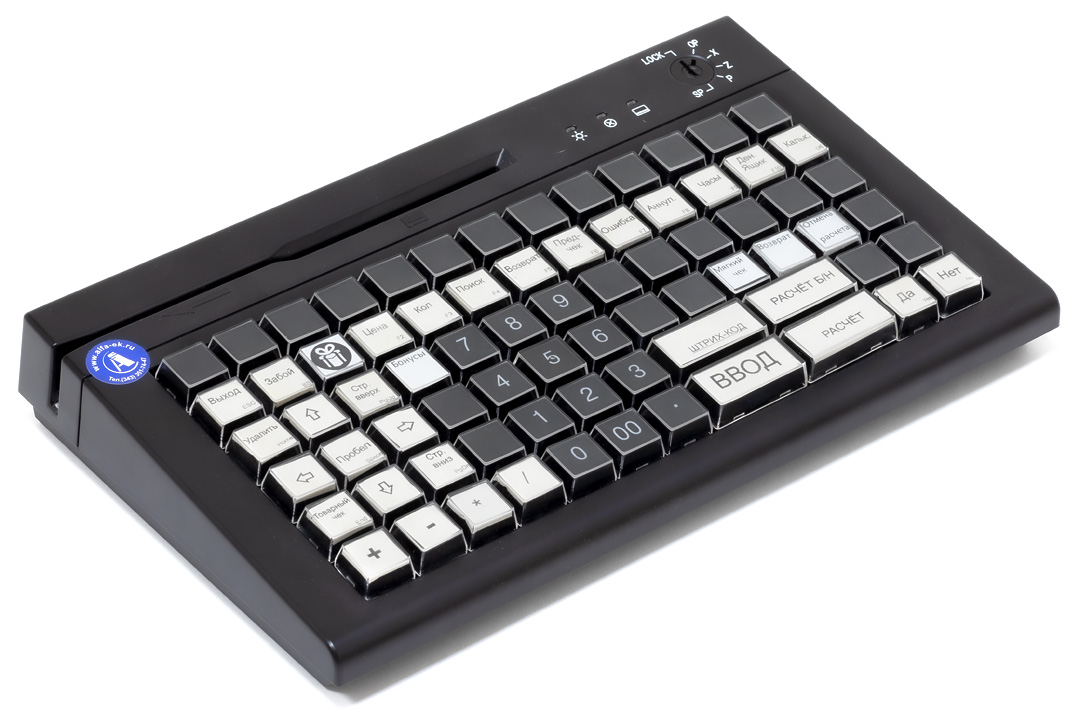 С картридером, 78 клавиш, черная. Легкая, компактная программируемая POS-клавиатура. 78 клавиш со встроенным считывателем магнитных карт и 6-позиционным ключом разграничения доступа. Программное обеспечение позволяет программировать не только клавиши клавиатуры, но и считыватель магнитных карт. Раскладка может загружаться в память клавиатуры из заранее созданного файла.